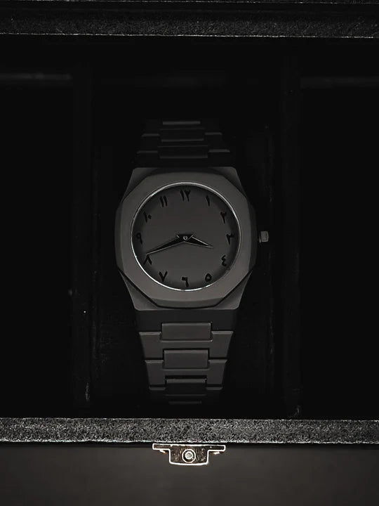 Sleek, bold, and timeless — the Noir Alwan blends minimalist modern design with cultural depth. Featuring a matte black octagonal case and a brushed steel strap, this timepiece is elevated by elegantly embossed Eastern Arabic numerals, creating a refined statement of heritage and sophistication. Designed for those who value subtlety and symbolism, Noir Alwan is not just a watch — it's a presence.