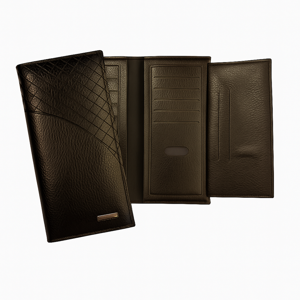 The Executive Luxe Leather Wallet is a sophisticated and stylish accessory crafted from premium black textured leather. Its tri-fold design showcases a sleek exterior adorned with diamond-pattern stitching, while the interior features multiple card slots, a transparent ID window, and full-length compartments for bills or documents. Perfect for professionals and style-conscious individuals, this wallet offers both functionality and refined elegance, making it an ideal choice for everyday use or formal occasions.