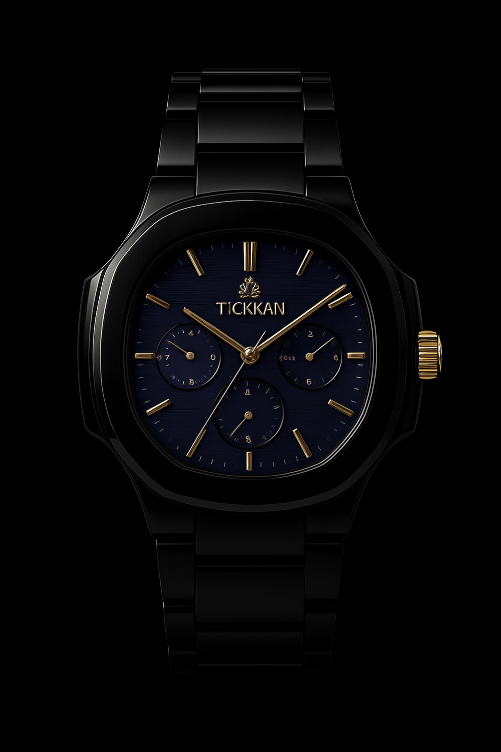 Exude sophistication with the Tickkan Midnight Royale Chronograph, a luxury timepiece crafted for the modern gentleman. This meticulously engineered watch features a deep navy textured dial accented with gold-tone indices and hands, set inside a polished black stainless steel case. Designed with functionality in mind, it includes three sub-dials for day, 24-hour, and seconds tracking, all powered by a precision quartz movement. The robust black metal bracelet adds a bold finish, making it a statement piece for formal and everyday wear alike.