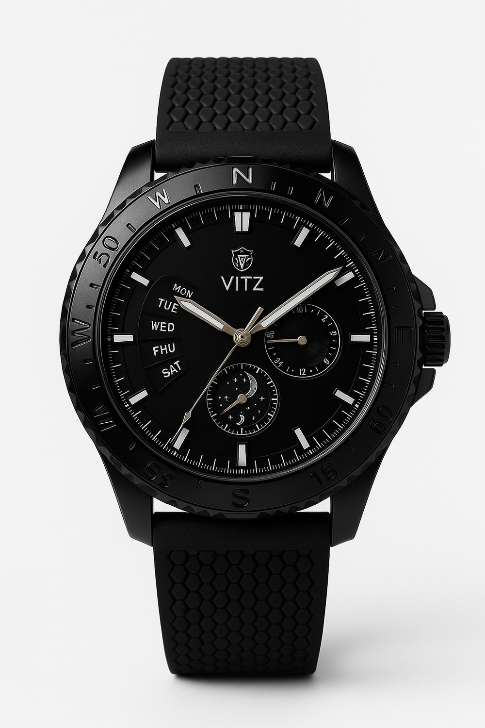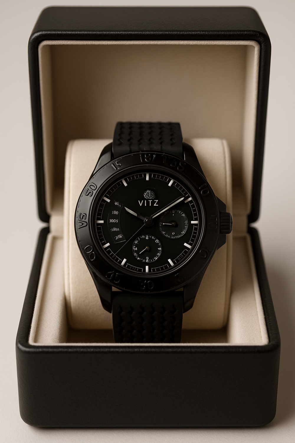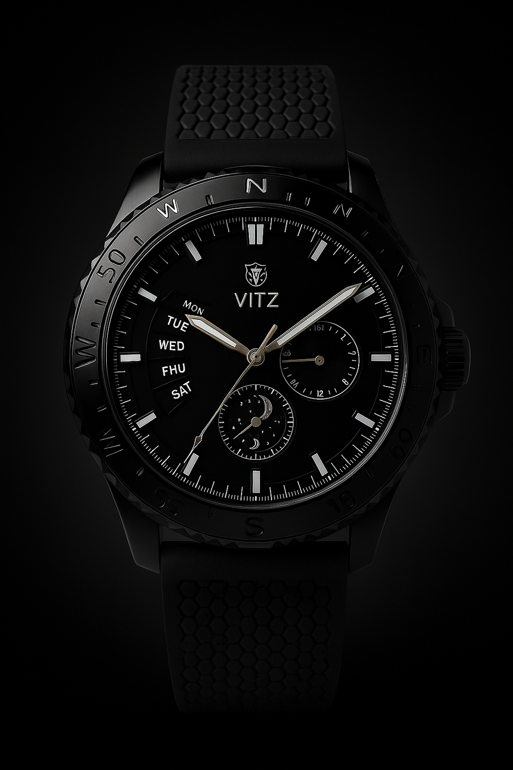 Command attention with the VITZ NightShadow Chronograph, where sleek design meets precision engineering. Crafted for those who move in style, this black-on-black masterpiece features a multi-dial face, luminous markers, and a bold matte finish.